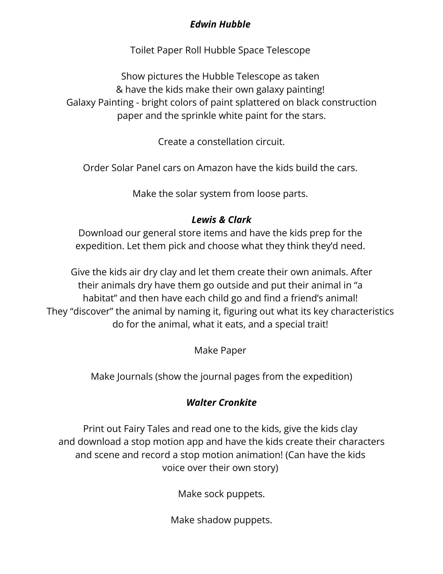 This digital download is just a list of project ideas under different categories! We have more substantial curriculum that will save you lots of time of researching, instructions, materials lists etc on our Full Curriculum page! This is a listing as seen on the preview of activities under each subject!